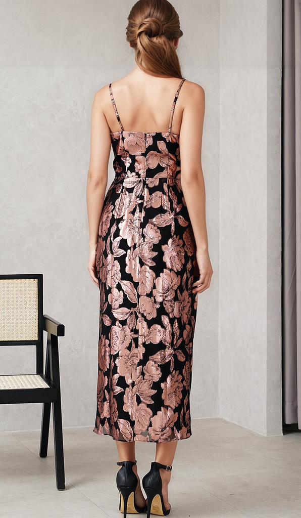 Add a bit of sparkle to your wardrobe this season with the Adrienne Dress. A party essential, it radiates glamour and style in its midi length silhouette featuring a metallic brocade shimmery print and flattering tulip skirt. Complete with an elegant center back zipper for added detail, you won't want to take off this luxe look!