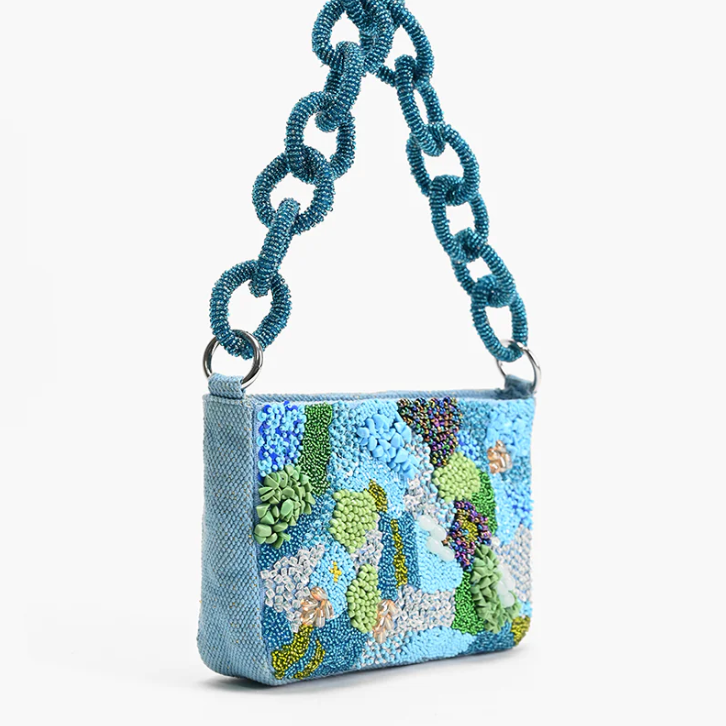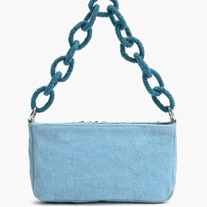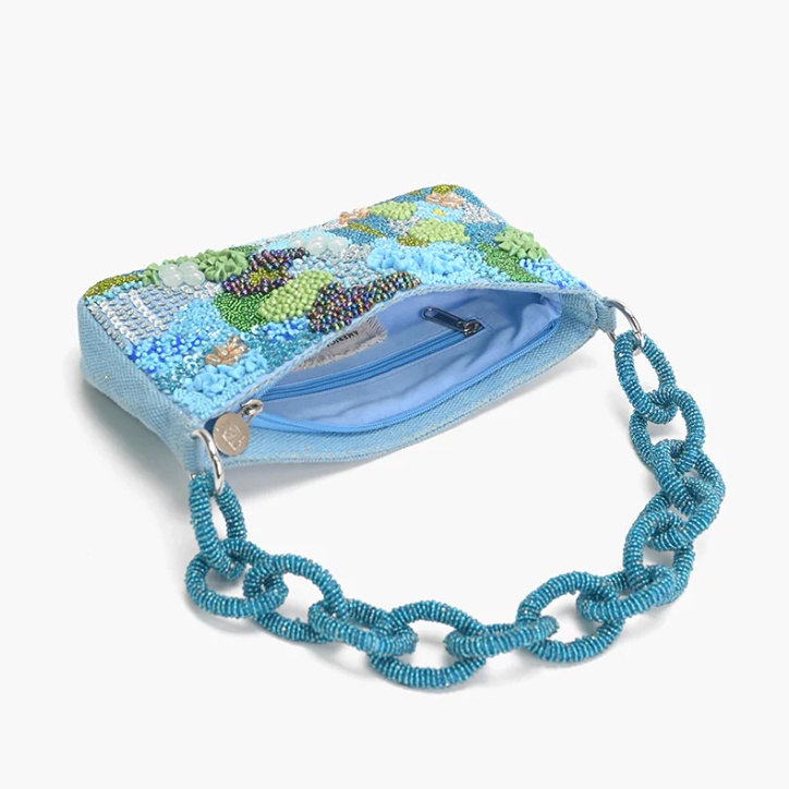 This elegant Blue Lagoon Glam Shoulder Bag is a statement piece perfect for any glamorous event or night out. Its design features a front abstract embellishment with intricate beadwork and a chain-linked top handle. The bag has a top zip fastening for security and a fully lined interior with a zip pocket for organization. Compact and stylish, it's ideal for carrying your essentials.