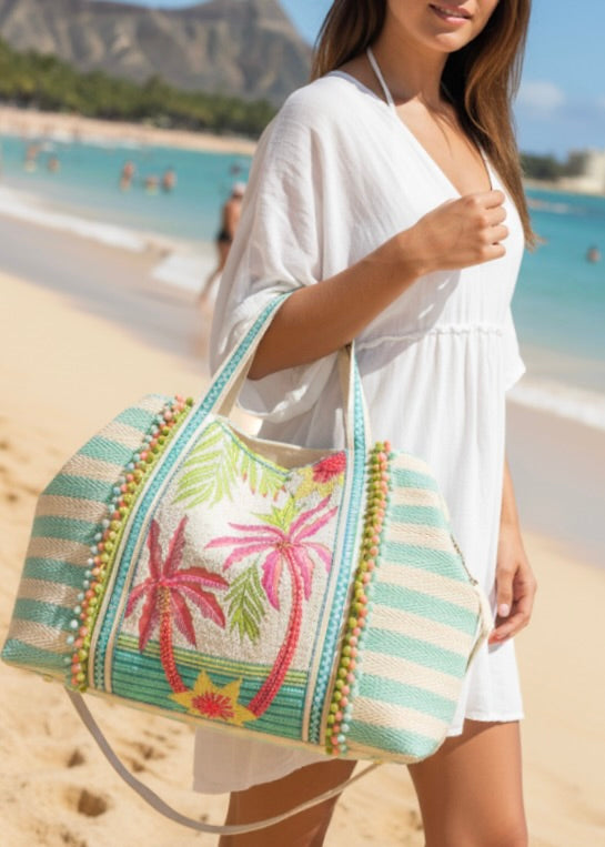 Pack your beach vibes and hit the road with the Palm Paradise Beaded Beach Tote Bag by AMERICA & BEYOND! Crafted from a comfy blend of 60% cotton and 40% polyester, this tote features a fun pompom lace detailing that adds a playful twist to any outfit. With two slip pockets and one zip pocket, keeping your essentials organized has never looked this good. And with a detachable long strap, you can carry it your way. Whether you're hitting the beach or running errands, this tote brings the good vibes!