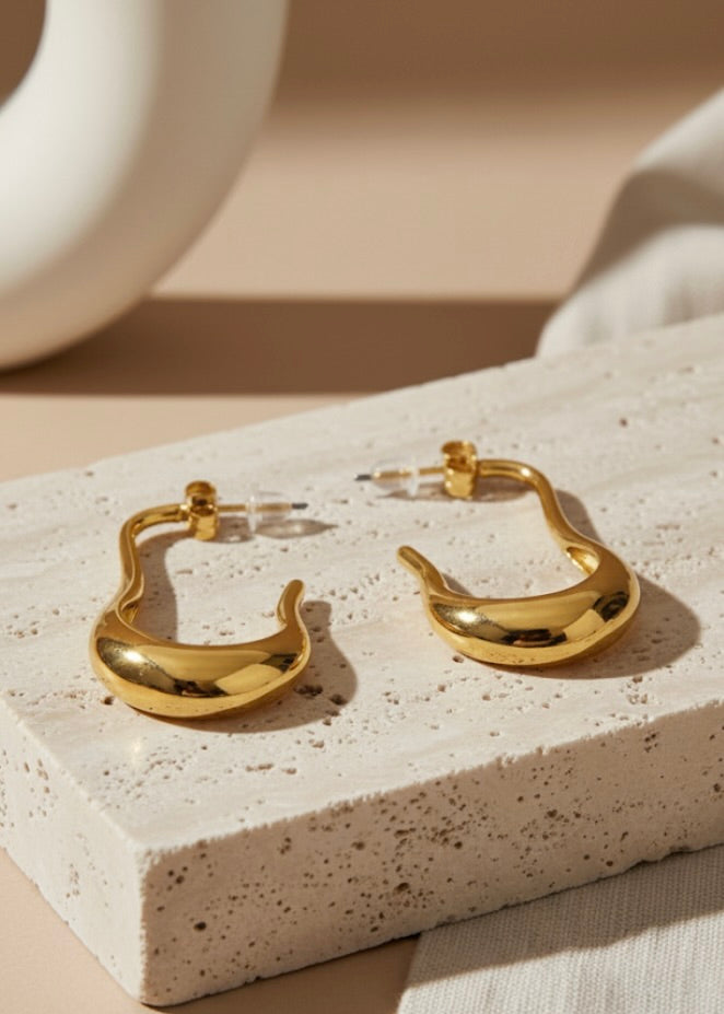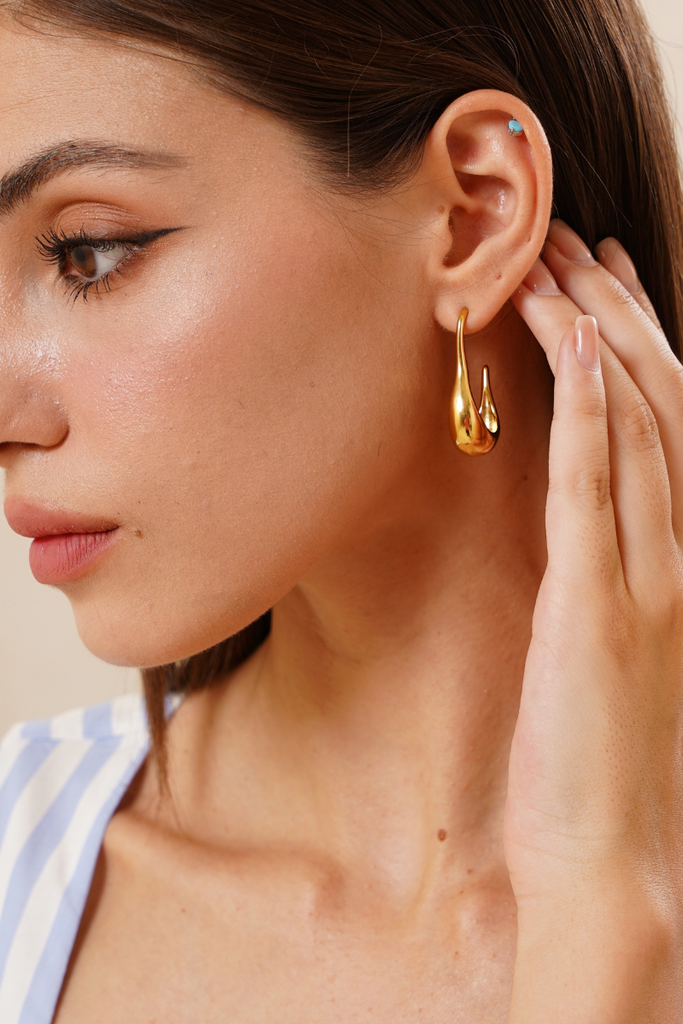 Illuminate your style with our Aura Earrings. These unique teardrop hoops are designed to catch and reflect light, creating a radiant glow that enhances your natural beauty. The sleek, polished gold finish and sculpted, fluid shape offer a modern take on a classic silhouette. Light yet substantial, they are the perfect statement piece to elevate any outfit, taking you effortlessly from day to night.