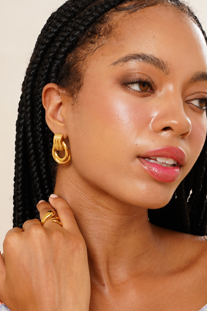 Make a bold statement with our Aurelia Hoops by AKAIYA. These stunning earrings feature a unique, layered design of polished gold that creates a brilliant, cascading effect. The fluid lines and radiant shine give them a luxurious, high-fashion appeal, while their elegant silhouette ensures they'll be a timeless addition to your collection. They are the perfect accessory to add a touch of modern glamour and sophisticated flair to your look.