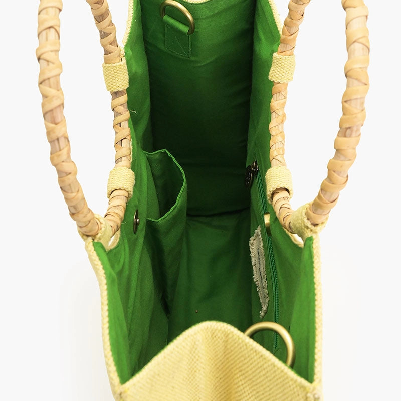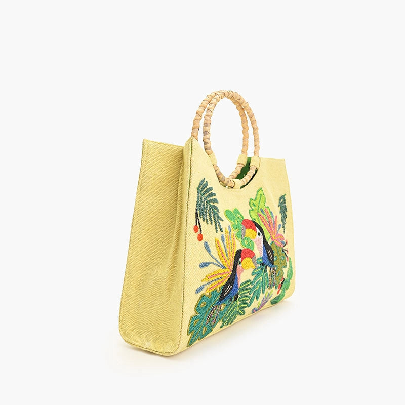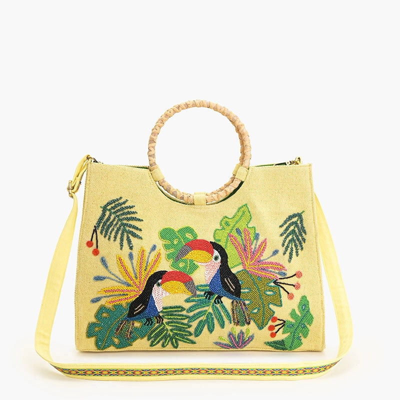 Bring on the tropical vibes! The Jungle Jive Beaded Tote by AMERICA & BEYOND is ready to fly high with its eye-catching tropical toucan embellishment that’ll instantly transport you to a sun-soaked paradise. Made with durable cotton and golden lurex butter yellow jacquard, this tote combines beauty with practicality, featuring round cane handles for a stylish touch. The top magnetic closure keeps everything secure, while the inside green poly lining with a zipper pocket, open slip pocket, and mobile pocket keeps you organized for your sunny adventures. Want hands-free? The detachable sling handle in butter yellow canvas gives you the freedom to move!
