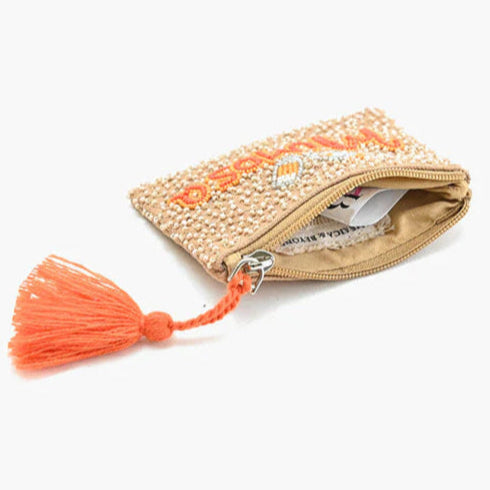 Each pouch features a front adorned with playful beads with “Mimosa” woven into this, making it the perfect accessory for your bubbly personality. Seal your treasures with the top zip closure and a tassel puller that adds a splash of fun. Crafted from durable hand woven jacquard, these pouches combine style and practicality. Compact yet spacious enough at 5.5 x 4 inches, they’re your go-to for keeping coins safe