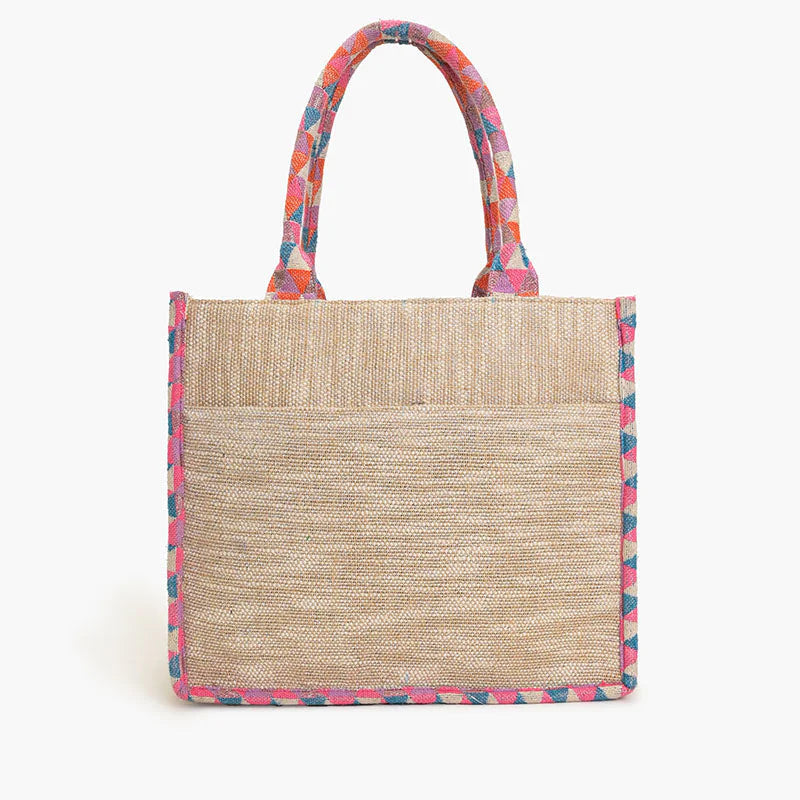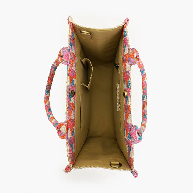 The Seashell Soirée Beaded Tote by AMERICA & BEYOND is all about adding some ocean-side charm with its fascinating embellishment of vibrant crabs and shells. It's a coastal dream you can carry every day! Crafted with durable beige jute and golden lurex jacquard, this bag’s got a beachy vibe with a luxe twist. The multicolor triangle patterned woven jacquard binding brings the perfect pop of color, while the brush antique finish fittings add a vintage touch. With top and back pockets featuring magnetic closures, your essentials are secure yet easy to grab. Inside, the beige poly lining with a zipper pocket, open slip pocket, and mobile pocket keeps you organized on your next beach adventure. Plus, the cord handle and detachable/adjustable natural webbing sling strap, embroidered with a blue diamond-shaped pattern, let you carry it your way!