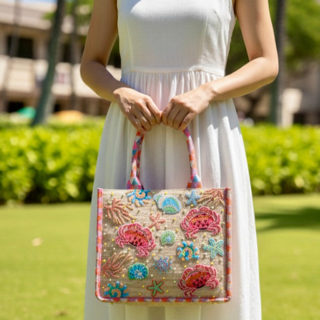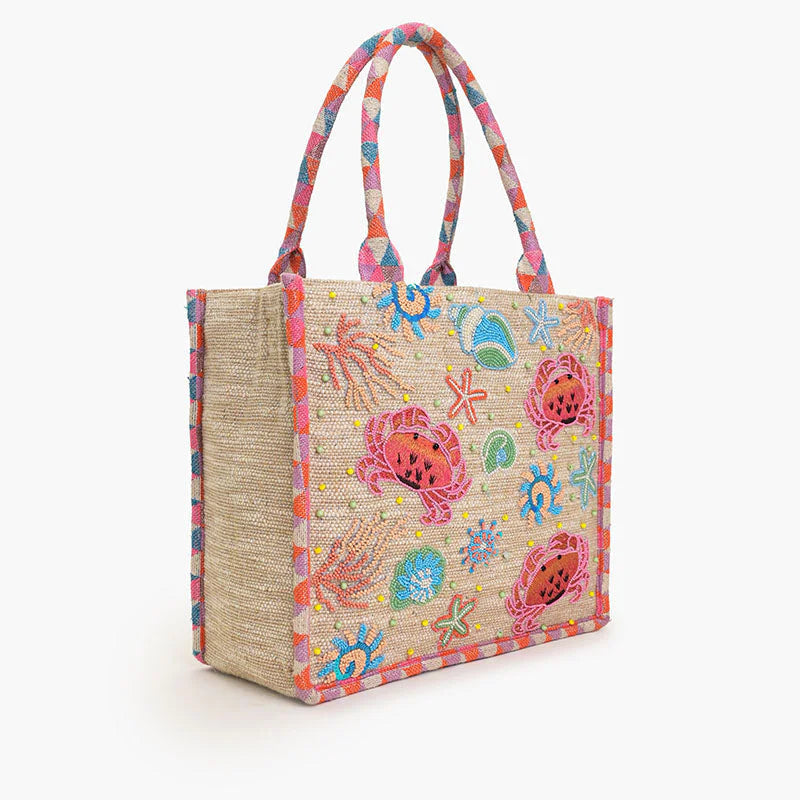 - Boxy tote bag with fascinating embellishment of vibrant crab and shells