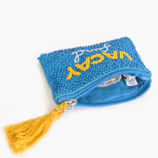 Our Vacation Fund Beaded Coin Pouch by AMERICA & BEYOND features a front adorned with playful beads and a subtle reminder “Vacay Fund” woven into the fabric. Secure your treasures with the convenient top zip closure and a cute tassel puller that adds a touch of fun. Crafted from durable hand woven jacquard, these pouches are both stylish and reliable.