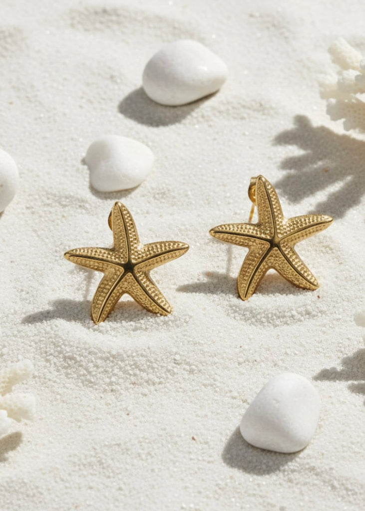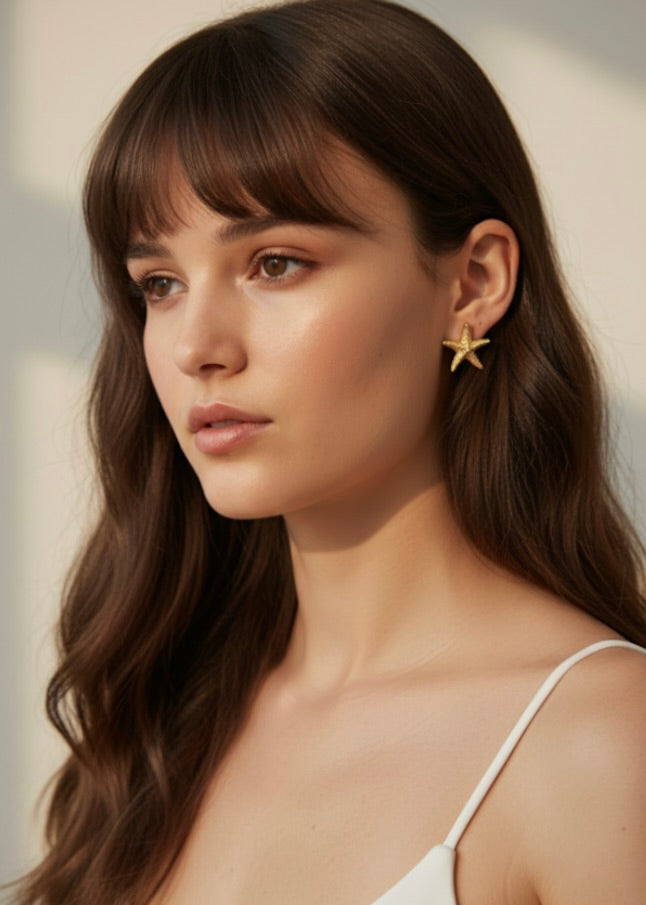 Dive into a world of elegance with our Tidal Treasure Gold Earrings by AKAIYA. These charming pieces capture the delicate, intricate details of a starfish, with a polished gold finish that shimmers like sunlight on the ocean's surface. The sculpted, textured design adds a touch of natural beauty and effortless style to any outfit. Lightweight and comfortable, these earrings are a perfect statement piece for a beach getaway or to bring a touch of coastal charm to your everyday look.