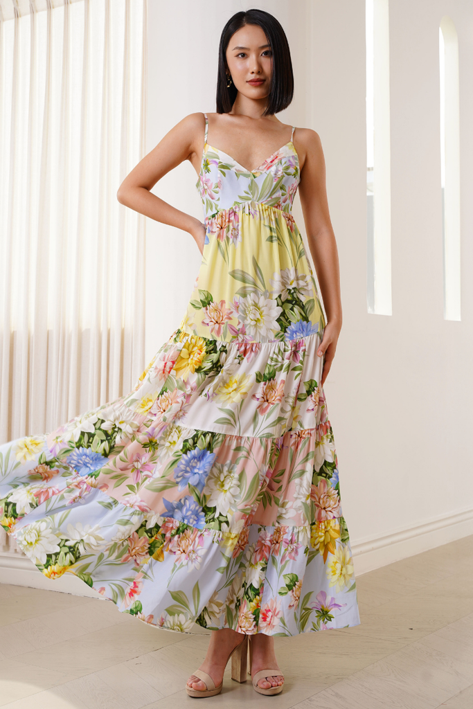 Capture the beauty of mixed florals in this gorgeous maxi dress. The flowing silhouette is complemented by a charming back tie detail. Perfect for weekend brunch or beach vacation.