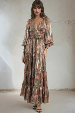 Shine effortlessly in this metallic maxi dress, featuring a flattering V-neckline, elastic waistband, and delicate button details. The tiered skirt adds movement and charm, making it perfect for weddings, galas, or evenings out. A stunning blend of comfort and glamour.