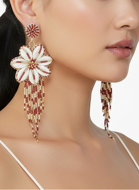 - Beaded Handmade Cute Sea Shell Floral Earrings with Beaded Tassel Hanging and Various Color Shades.