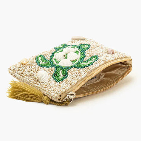 This adorable hand-beaded pouch by AMERICA & BEYOND inspired by the graceful sea turtle and shells, brings playful charm to your everyday essentials.