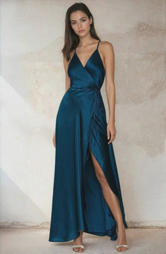 Our flowing Rush Hour Silk Satin Maxi Dress is your new go-to from weddings to your next event. The wrap maxi dress includes a crossover bodice with deep v-neckline, snap chest closure, self-tie waist, and cross-back adjustable spaghetti straps.