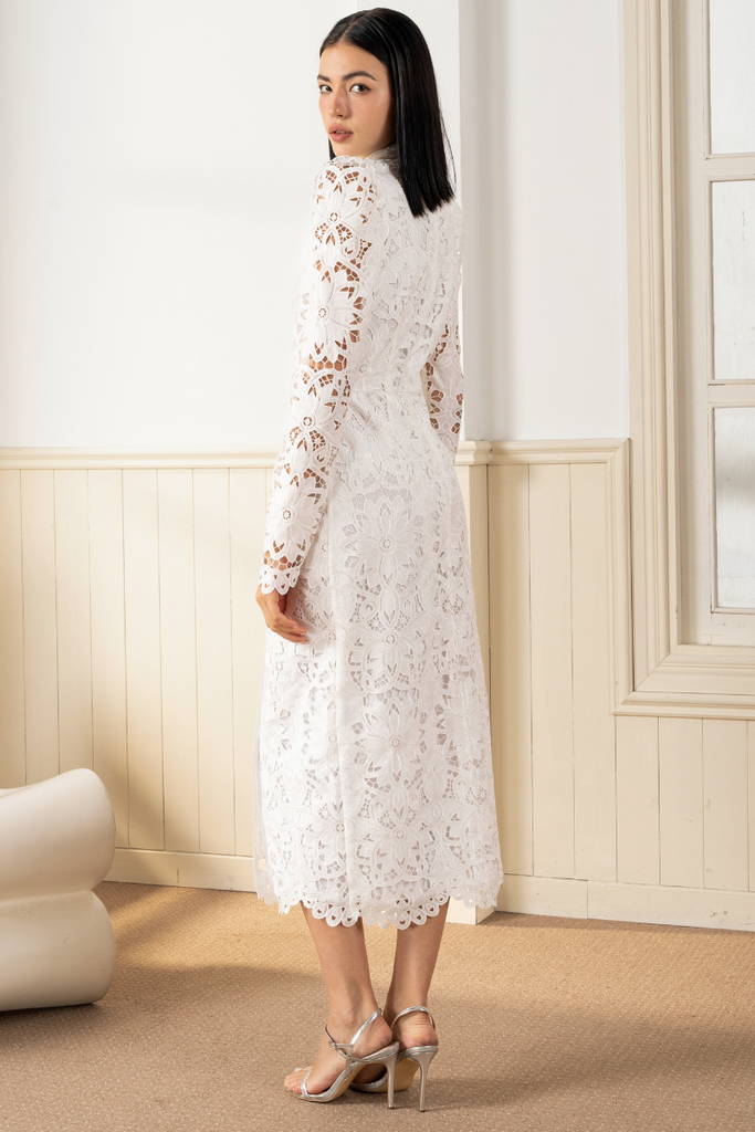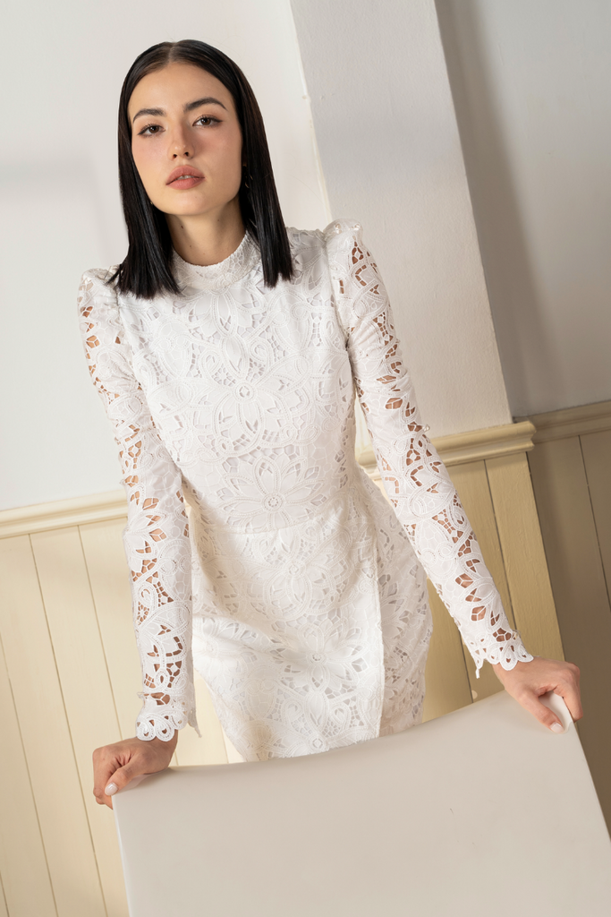 The Maybel lace dress is a stylish option for next event. This dress boasts a sophisticated high neckline, puffy shoulders, elegant long sleeves, and a figure-flattering pencil skirt.
