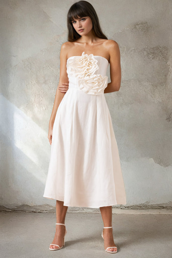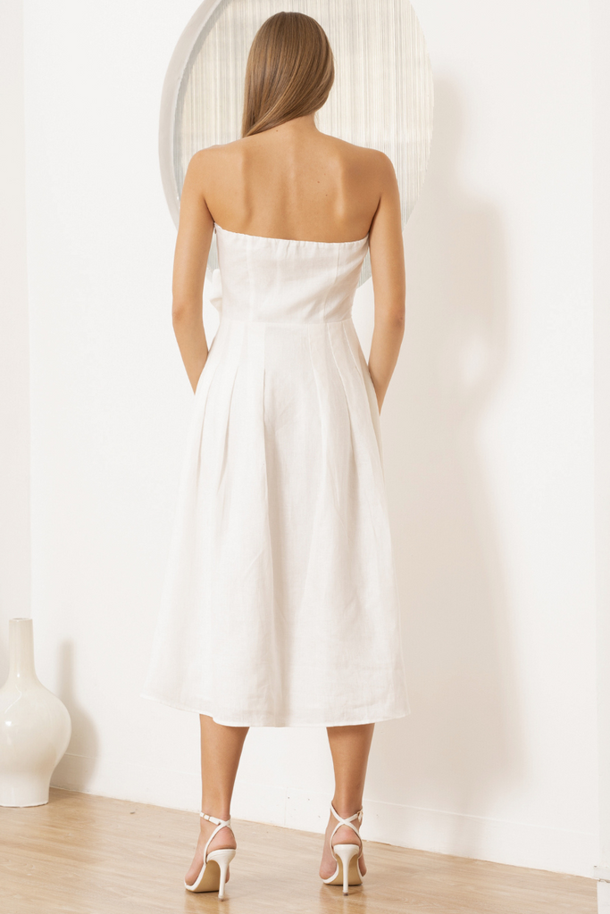 A chic strapless midi white linen dress with charming rose accents adorning the bodice, featuring invisible zippers and convenient pockets. Perfect for effortless summer style!