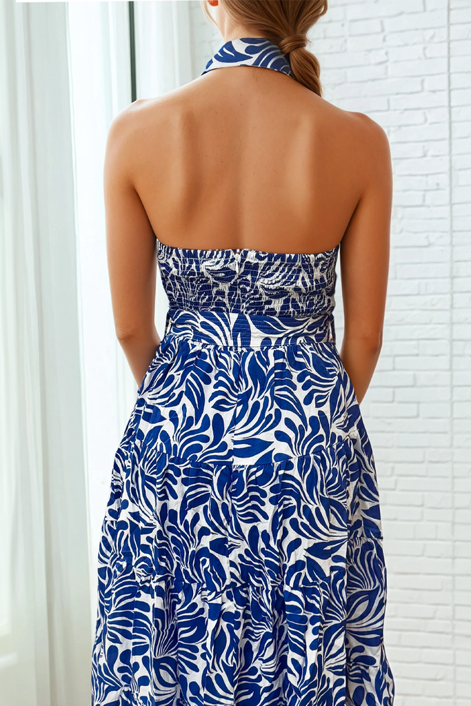 Embrace effortless style in this cotton maxi dress. With a flowing peasant skirt, pockets, and flattering back smocking, it's perfect for warm days and balmy nights. The halter neckline and button-up front add a touch of boho charm.