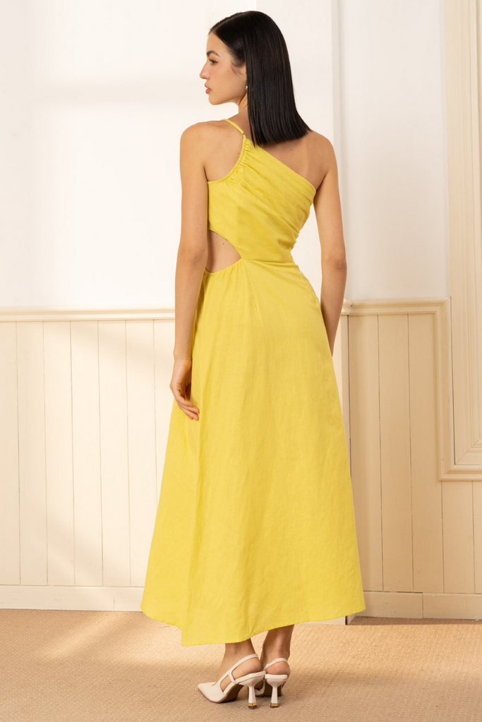 Get ready to turn heads in our stunning one-shoulder midi dress! Featuring a chic gathered design, cut-out waist, delicate rose petal details, and a flirty slit on the midi skirt.